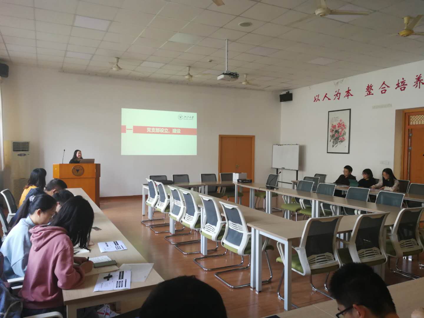 2020年10月20日下午,9999js金沙老品牌学生党支部的支书与部分支委齐聚教三440,一起学习《9999js金沙老品牌基层党务工作者务实培训》。本次培训的主讲老师是刘文静老师,刘老师从党支部的设立、建设,党支部组织生活制度,党员发展工作,党员教育管理工作,党支部工作规范以及经费报销管理等六个方面给各位党支书和支委讲解党务工作的重点和难点。